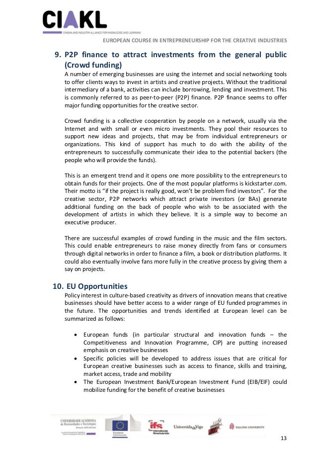 13. 13.                                                                      EUROPEAN COURSE IN ENTREPRENEURSHIP FOR THE CREATIVE INDUSTRIES  13    9. P2P  finance  to  attract  investments  from  the  general  public  (Crowd funding)  A number of emerging businesses are using the internet and social networking tools  to offer clients ways to invest in artists and creative projects. Without the traditional  intermediary of a bank, activities can include borrowing, lending and investment. This  is commonly referred to as peer‐to‐peer (P2P) finance. P2P finance seems to offer  major funding opportunities for the creative sector.    Crowd funding is a collective cooperation by people on a network, usually via the  Internet  and  with  small  or  even  micro  investments.  They  pool  their  resources  to  support  new  ideas  and  projects,  that  may  be  from  individual  entrepreneurs  or  organizations.  This  kind  of  support  has  much  to  do  with  the  ability  of  the  entrepreneurs to successfully communicate their idea to the potential backers (the  people who will provide the funds).    This is an emergent trend and it opens one more possibility to the entrepreneurs to  obtain funds for their projects. One of the most popular platforms is kickstarter.com.  Their motto is “if the project is really good, won’t be problem find investors”.  For the  creative  sector,  P2P  networks  which  attract  private  investors  (or  BAs)  generate  additional  funding  on  the  back  of  people  who  wish  to  be  associated  with  the  development  of  artists  in  which  they  believe.  It  is  a  simple  way  to  become  an  executive producer.     There are successful examples of crowd funding in the music and the film sectors.  This  could  enable  entrepreneurs  to  raise  money  directly  from  fans  or  consumers  through digital networks in order to finance a film, a book or distribution platforms. It  could also eventually involve fans more fully in the creative process by giving them a  say on projects.    10. EU Opportunities  Policy interest in culture‐based creativity as drivers of innovation means that creative  businesses should have better access to a wider range of EU funded programmes in  the  future.  The  opportunities  and  trends  identified  at  European  level  can  be  summarized as follows:     European  funds  (in  particular  structural  and  innovation  funds  –  the  Competitiveness  and  Innovation  Programme,  CIP)  are  putting  increased  emphasis on creative businesses   Specific  policies  will  be  developed  to  address  issues  that  are  critical  for  European  creative  businesses  such  as  access  to  finance,  skills  and  training,  market access, trade and mobility   The  European  Investment  Bank/European  Investment  Fund  (EIB/EIF)  could  mobilize funding for the benefit of creative businesses