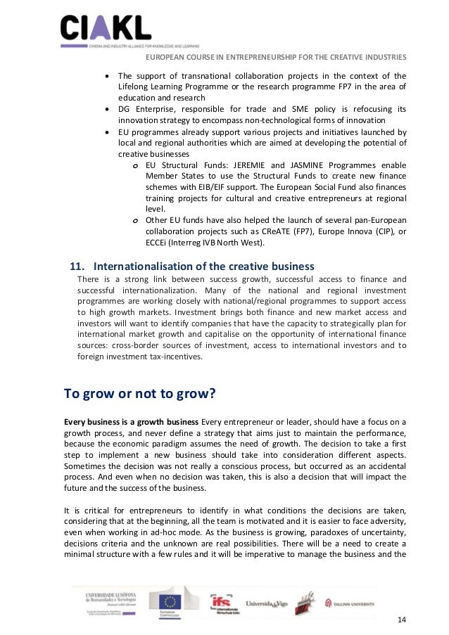 14. 14.                                                                      EUROPEAN COURSE IN ENTREPRENEURSHIP FOR THE CREATIVE INDUSTRIES  14     The  support  of  transnational  collaboration  projects  in  the  context  of  the  Lifelong Learning Programme or the research programme FP7 in the area of  education and research   DG  Enterprise,  responsible  for  trade  and  SME  policy  is  refocusing  its  innovation strategy to encompass non‐technological forms of innovation   EU programmes already support various projects and initiatives launched by  local and regional authorities which are aimed at developing the potential of  creative businesses  o EU  Structural  Funds:  JEREMIE  and  JASMINE  Programmes  enable  Member  States  to  use  the  Structural  Funds  to  create  new  finance  schemes with EIB/EIF support. The European Social Fund also finances  training  projects  for  cultural  and  creative  entrepreneurs  at  regional  level.   o Other EU funds have also helped the launch of several pan‐European  collaboration projects such as CReATE (FP7), Europe Innova (CIP), or  ECCEi (Interreg IVB North West).    11.  Internationalisation of the creative business  There  is  a  strong  link  between  success  growth,  successful  access  to  finance  and  successful  internationalization.  Many  of  the  national  and  regional  investment  programmes are working closely with national/regional programmes to support access  to  high  growth  markets.  Investment  brings  both  finance  and  new  market  access  and  investors will want to identify companies that have the capacity to strategically plan for  international market growth and capitalise on the opportunity of international finance  sources:  cross‐border  sources  of  investment,  access  to  international  investors  and  to  foreign investment tax‐incentives.    To grow or not to grow?    Every business is a growth business Every entrepreneur or leader, should have a focus on a  growth process, and never define a strategy that aims just to maintain the performance,  because the economic paradigm assumes the need of growth. The decision to take a first  step  to  implement  a  new  business  should  take  into  consideration  different  aspects.  Sometimes the decision was not really a conscious process, but occurred as an accidental  process. And even when no decision was taken, this is also a decision that will impact the  future and the success of the business.    It  is  critical  for  entrepreneurs  to  identify  in  what  conditions  the  decisions  are  taken,  considering that at the beginning, all the team is motivated and it is easier to face adversity,  even when working in ad‐hoc mode. As the business is growing, paradoxes of uncertainty,  decisions criteria and the unknown are real possibilities. There will be a need to create a  minimal structure with a few rules and it will be imperative to manage the business and the