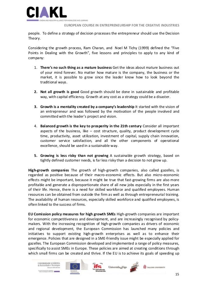 15. 15.                                                                      EUROPEAN COURSE IN ENTREPRENEURSHIP FOR THE CREATIVE INDUSTRIES  15    people.  To define a strategy of decision processes the entrepreneur should use the Decision  Theory.    Considering the growth process, Ram Charan, and  Noel M Tichy (1999) defined the “Five  Points  in  Dealing  with  the  Growth”,  five  lessons  and  principles  to  apply  to  any  kind  of  company:    1. There’s no such thing as a mature business Get the ideas about mature business out  of your mind forever. No matter how mature is the company, the business or the  market,  it  is  possible  to  grow  since  the  leader  know  how  to  look  beyond  the  traditional ways.    2. Not all growth is good Good growth should be done in sustainable and profitable  way, with capital efficiency. Growth at any cost as a strategy could be a disaster.    3. Growth is a mentality created by a company’s leadership It started with the vision of  an  entrepreneur  and  was  followed  by  the  motivation  of  the  people  involved  and  committed with the leader’s project and vision.    4. Balanced growth is the key to prosperity in the 21th century Consider all important  aspects  of  the  business,  like  –  cost  structure,  quality,  product  development  cycle  time, productivity, asset utilization, investment of capital, supply chain innovation,  customer  service  satisfaction,  and  all  the  other  components  of  operational  excellence, should be used in a sustainable way.    5. Growing  is  less  risky  than  not  growing  A  sustainable  growth  strategy,  based  on  tightly defined customer needs, is far less risky than a decision to not grow up.    High‐growth  companies  The  growth  of  high‐growth  companies,  also  called  gazelles,  is  regarded  as  positive  because  of  their  macro‐economic  effects.  But  also  micro‐economic  effects might be important, because it might be true that fast‐growing firms are also more  profitable and generate a disproportionate share of all new jobs especially in the first years  of their life. Hence, there is a need for skilled workforce and qualified employees. Human  resources can be obtained from outside the firm as well as through entrepreneurial training.  The availability of human resources, especially skilled workforce and qualified employees, is  often linked to the success of firms.    EU Comission policy measures for high growth SMEs High‐growth companies are important  for economic competitiveness and development, and are increasingly recognised by policy‐ makers. With the increasing recognition of high‐growth companies as drivers of economic  and  regional  development,  the  European  Commission  has  launched  many  policies  and  initiatives  to  support  existing  high‐growth  enterprises  as  well  as  to  enhance  their  emergence. Policies that are designed in a SME‐friendly issue might be especially applied for  gazelles. The European Commission developed and implemented a range of policy measures,  specifically to assist SMEs in Europe. These policies are aimed at creating conditions through  which small firms can be created and thrive. If the EU is to achieve its goals of speeding up