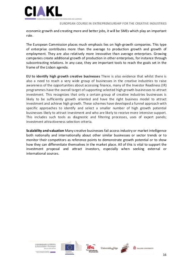 16. 16.                                                                      EUROPEAN COURSE IN ENTREPRENEURSHIP FOR THE CREATIVE INDUSTRIES  16    economic growth and creating more and better jobs, it will be SMEs which play an important  role.    The European Commission places much emphasis lies on high‐growth companies. This type  of  enterprise  contributes  more  than  the  average  to  production  growth  and  growth  of  employment.  They  are  also  relatively  more  innovative  than  average  enterprises.  Growing  companies create additional growth of production in other enterprises, for instance through  subcontracting relations. In any case, they are important tools to reach the goals set in the  frame of the Lisbon agenda.    EU to identify high growth creative businesses There is also evidence that whilst there is  also  a  need  to  reach  a  very  wide  group  of  businesses  in  the  creative  industries  to  raise  awareness of the opportunities about accessing finance, many of the Investor Readiness (IR)  programmes have the overall target of supporting selected high growth businesses to attract  investment.  This  recognizes  that  only  a  certain  group  of  creative  industries  businesses  is  likely  to  be  sufficiently  growth  oriented  and  have  the  right  business  model  to  attract  investment and achieve high growth. These schemes have developed a funnel approach with  specific  approaches  to  identify  and  select  a  smaller  number  of  high  growth  potential  businesses likely to attract investment and who are likely to receive more intensive support.  This  includes  such  tools  as  diagnostic  and  filtering  processes,  uses  of  expert  panels;  investment attractiveness selection criteria.    Scalability and valuation Many creative businesses fail access industry or market intelligence  both  nationally  and  internationally  about  other  similar  businesses  or  sector  trends  or  to  monitor their competitors as reference points to demonstrate growth potential or to show  how they can differentiate themselves in the market place. All of this is vital to support the  investment  proposal  and  attract  investors,  especially  when  seeking  external  or    international sources.