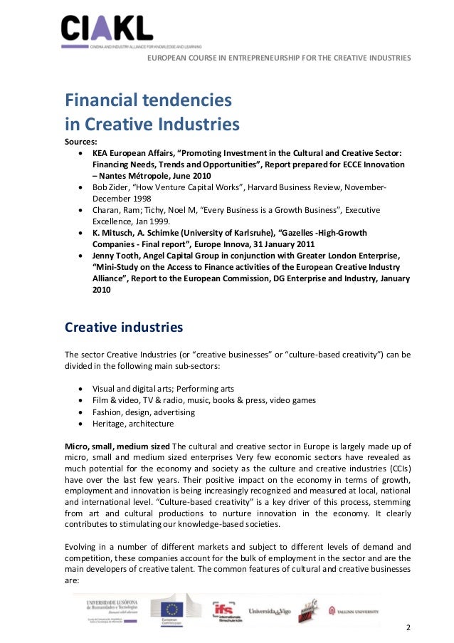 2. 2.                                                                      EUROPEAN COURSE IN ENTREPRENEURSHIP FOR THE CREATIVE INDUSTRIES  2      Financial tendencies  in Creative Industries  Sources:    KEA European Affairs, “Promoting Investment in the Cultural and Creative Sector:  Financing Needs, Trends and Opportunities”, Report prepared for ECCE Innovation  – Nantes Métropole, June 2010   Bob Zider, “How Venture Capital Works”, Harvard Business Review, November‐ December 1998   Charan, Ram; Tichy, Noel M, “Every Business is a Growth Business”, Executive  Excellence, Jan 1999.   K. Mitusch, A. Schimke (University of Karlsruhe), “Gazelles ‐High‐Growth  Companies ‐ Final report”, Europe Innova, 31 January 2011    Jenny Tooth, Angel Capital Group in conjunction with Greater London Enterprise,  “Mini‐Study on the Access to Finance activities of the European Creative Industry  Alliance”, Report to the European Commission, DG Enterprise and Industry, January  2010      Creative industries    The sector Creative Industries (or “creative businesses” or “culture‐based creativity”) can be  divided in the following main sub‐sectors:     Visual and digital arts; Performing arts   Film & video, TV & radio, music, books & press, video games   Fashion, design, advertising   Heritage, architecture    Micro, small, medium sized The cultural and creative sector in Europe is largely made up of  micro,  small  and  medium  sized  enterprises  Very  few  economic  sectors  have  revealed  as  much  potential  for  the  economy  and  society  as  the  culture  and  creative  industries  (CCIs)  have  over  the  last  few  years.  Their  positive  impact  on  the  economy  in  terms  of  growth,  employment and innovation is being increasingly recognized and measured at local, national  and international level. “Culture‐based creativity” is a key driver of this process, stemming  from  art  and  cultural  productions  to  nurture  innovation  in  the  economy.  It  clearly  contributes to stimulating our knowledge‐based societies.    Evolving  in  a  number  of  different  markets  and  subject  to  different  levels  of  demand  and  competition, these companies account for the bulk of employment in the sector and are the  main developers of creative talent. The common features of cultural and creative businesses  are: