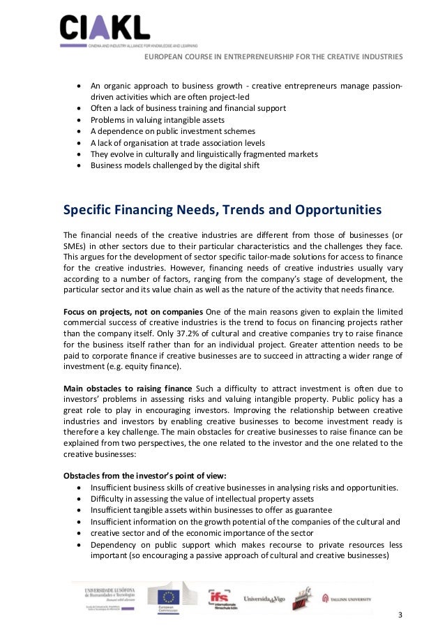 3. 3.                                                                      EUROPEAN COURSE IN ENTREPRENEURSHIP FOR THE CREATIVE INDUSTRIES  3       An organic approach to business growth ‐ creative entrepreneurs manage passion‐ driven activities which are often project‐led   Often a lack of business training and financial support   Problems in valuing intangible assets   A dependence on public investment schemes   A lack of organisation at trade association levels   They evolve in culturally and linguistically fragmented markets   Business models challenged by the digital shift      Specific Financing Needs, Trends and Opportunities    The  financial  needs  of  the  creative  industries  are  different  from  those  of  businesses  (or  SMEs) in other sectors due to their particular characteristics and the challenges they face.  This argues for the development of sector specific tailor‐made solutions for access to finance  for  the  creative  industries.  However,  financing  needs  of  creative  industries  usually  vary  according to a number of factors, ranging from the company’s stage of development, the  particular sector and its value chain as well as the nature of the activity that needs finance.    Focus on projects, not on companies One of the main reasons given to explain the limited  commercial success of creative industries is the trend to focus on financing projects rather  than the company itself. Only 37.2% of cultural and creative companies try to raise finance  for the business itself rather than for an individual project. Greater attention needs to be  paid to corporate finance if creative businesses are to succeed in attracting a wider range of  investment (e.g. equity finance).    Main  obstacles  to  raising  finance  Such  a  difficulty  to  attract  investment  is  often  due  to  investors’  problems  in  assessing  risks  and  valuing  intangible  property.  Public  policy  has  a  great  role  to  play  in  encouraging  investors.  Improving  the  relationship  between  creative  industries  and  investors  by  enabling  creative  businesses  to  become  investment  ready  is  therefore a key challenge. The main obstacles for creative businesses to raise finance can be  explained from two perspectives, the one related to the investor and the one related to the  creative businesses:    Obstacles from the investor’s point of view:   Insufficient business skills of creative businesses in analysing risks and opportunities.   Difficulty in assessing the value of intellectual property assets   Insufficient tangible assets within businesses to offer as guarantee   Insufficient information on the growth potential of the companies of the cultural and   creative sector and of the economic importance of the sector   Dependency  on  public  support  which  makes  recourse  to  private  resources  less  important (so encouraging a passive approach of cultural and creative businesses)