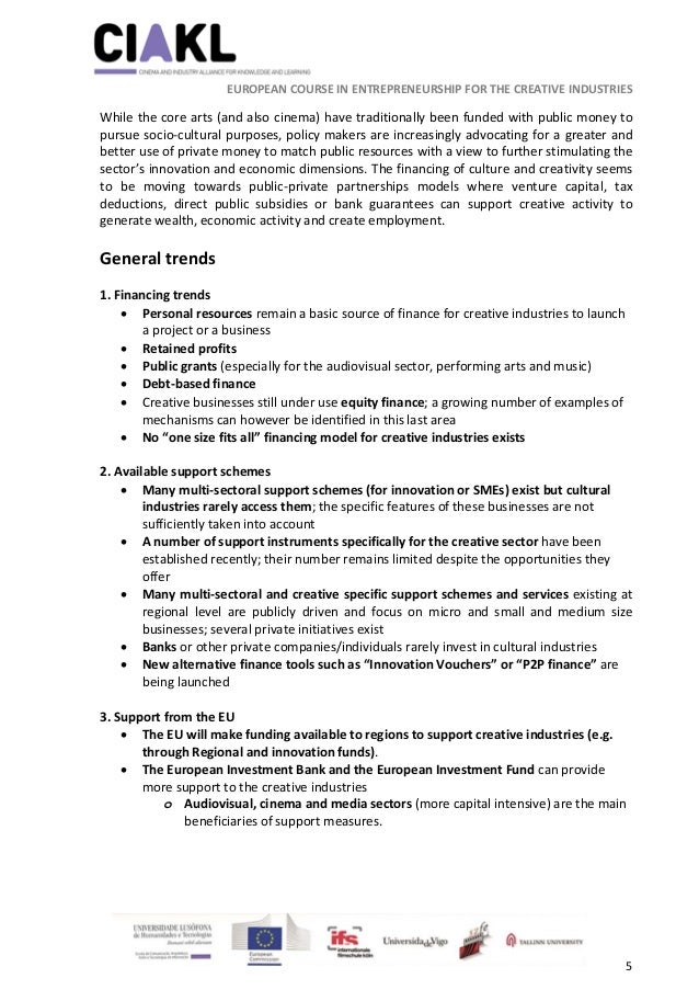 5. 5.                                                                      EUROPEAN COURSE IN ENTREPRENEURSHIP FOR THE CREATIVE INDUSTRIES  5    While the core arts (and also cinema) have traditionally been funded with public money to  pursue socio‐cultural purposes, policy makers are increasingly advocating for a greater and  better use of private money to match public resources with a view to further stimulating the  sector’s innovation and economic dimensions. The financing of culture and creativity seems  to  be  moving  towards  public‐private  partnerships  models  where  venture  capital,  tax  deductions,  direct  public  subsidies  or  bank  guarantees  can  support  creative  activity  to  generate wealth, economic activity and create employment.    General trends     1. Financing trends   Personal resources remain a basic source of finance for creative industries to launch  a project or a business   Retained profits   Public grants (especially for the audiovisual sector, performing arts and music)    Debt‐based finance   Creative businesses still under use equity finance; a growing number of examples of  mechanisms can however be identified in this last area   No “one size fits all” financing model for creative industries exists    2. Available support schemes   Many multi‐sectoral support schemes (for innovation or SMEs) exist but cultural  industries rarely access them; the specific features of these businesses are not  sufficiently taken into account   A number of support instruments specifically for the creative sector have been  established recently; their number remains limited despite the opportunities they  offer   Many multi‐sectoral and creative specific support schemes and services existing at  regional  level  are  publicly  driven  and  focus  on  micro  and  small  and  medium  size  businesses; several private initiatives exist   Banks or other private companies/individuals rarely invest in cultural industries    New alternative finance tools such as “Innovation Vouchers” or “P2P finance” are  being launched     3. Support from the EU   The EU will make funding available to regions to support creative industries (e.g.  through Regional and innovation funds).   The European Investment Bank and the European Investment Fund can provide  more support to the creative industries  o Audiovisual, cinema and media sectors (more capital intensive) are the main  beneficiaries of support measures.