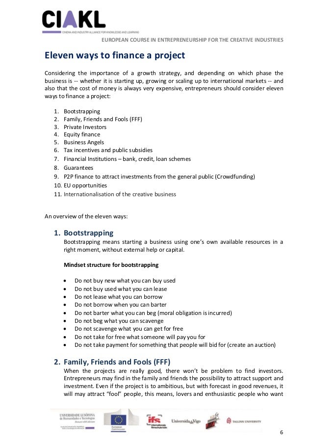 6. 6.                                                                      EUROPEAN COURSE IN ENTREPRENEURSHIP FOR THE CREATIVE INDUSTRIES  6    Eleven ways to finance a project    Considering  the  importance  of  a  growth  strategy,  and  depending  on  which  phase  the  business is ‐‐ whether it is starting up, growing or scaling up to international markets ‐‐ and  also that the cost of money is always very expensive, entrepreneurs should consider eleven  ways to finance a project:    1. Bootstrapping  2. Family, Friends and Fools (FFF)  3. Private Investors  4. Equity finance  5. Business Angels  6. Tax incentives and public subsidies  7. Financial Institutions – bank, credit, loan schemes  8. Guarantees  9. P2P finance to attract investments from the general public (Crowdfunding)  10. EU opportunities  11. Internationalisation of the creative business    An overview of the eleven ways:    1. Bootstrapping  Bootstrapping  means  starting  a  business  using  one’s  own  available  resources  in  a  right moment, without external help or capital.     Mindset structure for bootstrapping      Do not buy new what you can buy used   Do not buy used what you can lease   Do not lease what you can borrow   Do not borrow when you can barter   Do not barter what you can beg (moral obligation is incurred)   Do not beg what you can scavenge   Do not scavenge what you can get for free   Do not take for free what someone will pay you for   Do not take payment for something that people will bid for (create an auction)    2. Family, Friends and Fools (FFF)  When  the  projects  are  really  good,  there  won’t  be  problem  to  find  investors.  Entrepreneurs may find in the family and friends the possibility to attract support and  investment. Even if the project is to ambitious, but with forecast in good revenues, it  will may attract “fool” people, this means, lovers and enthusiastic people who want
