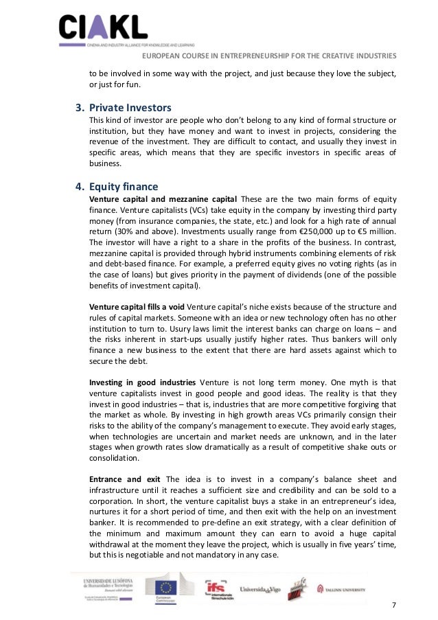 7. 7.                                                                      EUROPEAN COURSE IN ENTREPRENEURSHIP FOR THE CREATIVE INDUSTRIES  7    to be involved in some way with the project, and just because they love the subject,  or just for fun.    3. Private Investors  This kind of investor are people who don’t belong to any kind of formal structure or  institution,  but  they  have  money  and  want  to  invest  in  projects,  considering  the  revenue of the investment. They are difficult to contact, and usually they invest in  specific  areas,  which  means  that  they  are  specific  investors  in  specific  areas  of  business.    4. Equity finance  Venture  capital  and  mezzanine  capital  These  are  the  two  main  forms  of  equity  finance. Venture capitalists (VCs) take equity in the company by investing third party  money (from insurance companies, the state, etc.) and look for a high rate of annual  return (30% and above). Investments usually range from €250,000 up to €5 million.  The investor will have a right to a share in the profits of the business. In contrast,  mezzanine capital is provided through hybrid instruments combining elements of risk  and debt‐based finance. For example, a preferred equity gives no voting rights (as in  the case of loans) but gives priority in the payment of dividends (one of the possible  benefits of investment capital).    Venture capital fills a void Venture capital’s niche exists because of the structure and  rules of capital markets. Someone with an idea or new technology often has no other  institution to turn to. Usury laws limit the interest banks can charge on loans – and  the  risks  inherent  in  start‐ups  usually  justify  higher  rates.  Thus  bankers  will  only  finance  a  new  business  to  the  extent  that  there  are  hard  assets  against  which  to  secure the debt.     Investing  in  good  industries  Venture  is  not  long  term  money.  One  myth  is  that  venture  capitalists  invest  in  good  people  and  good  ideas.  The  reality  is  that  they  invest in good industries – that is, industries that are more competitive forgiving that  the market as whole. By investing in high growth areas VCs primarily consign their  risks to the ability of the company’s management to execute. They avoid early stages,  when technologies are uncertain and market needs are unknown, and in the later  stages when growth rates slow dramatically as a result of competitive shake outs or  consolidation.     Entrance  and  exit  The  idea  is  to  invest  in  a  company’s  balance  sheet  and  infrastructure  until  it  reaches  a  sufficient  size  and  credibility  and can  be  sold  to  a  corporation. In short, the venture capitalist buys a stake in an entrepreneur’s idea,  nurtures it for a short period of time, and then exit with the help on an investment  banker. It is recommended to pre‐define an exit strategy, with a clear definition of  the  minimum  and  maximum  amount  they  can  earn  to  avoid  a  huge  capital  withdrawal at the moment they leave the project, which is usually in five years’ time,  but this is negotiable and not mandatory in any case.