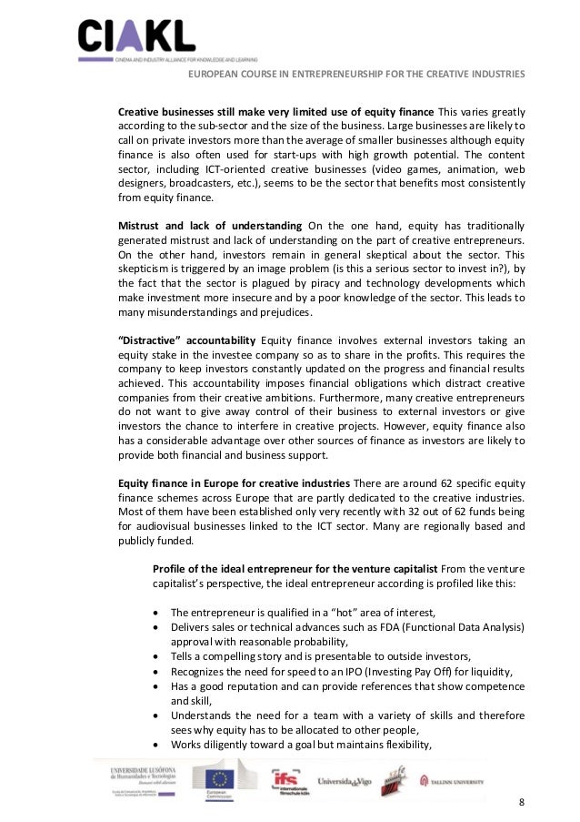 8. 8.                                                                      EUROPEAN COURSE IN ENTREPRENEURSHIP FOR THE CREATIVE INDUSTRIES  8      Creative businesses still make very limited use of equity finance This varies greatly  according to the sub‐sector and the size of the business. Large businesses are likely to  call on private investors more than the average of smaller businesses although equity  finance  is  also  often  used  for  start‐ups  with  high  growth  potential.  The  content  sector,  including  ICT‐oriented  creative  businesses  (video  games,  animation,  web  designers, broadcasters, etc.), seems to be the sector that benefits most consistently  from equity finance.    Mistrust  and  lack  of  understanding  On  the  one  hand,  equity  has  traditionally  generated mistrust and lack of understanding on the part of creative entrepreneurs.  On  the  other  hand,  investors  remain  in  general  skeptical  about  the  sector.  This  skepticism is triggered by an image problem (is this a serious sector to invest in?), by  the  fact  that  the  sector  is  plagued  by  piracy  and  technology  developments  which  make investment more insecure and by a poor knowledge of the sector. This leads to  many misunderstandings and prejudices.     “Distractive”  accountability  Equity  finance  involves  external  investors  taking  an  equity stake in the investee company so as to share in the profits. This requires the  company to keep investors constantly updated on the progress and financial results  achieved.  This  accountability  imposes  financial  obligations  which  distract  creative  companies from their creative ambitions. Furthermore, many creative entrepreneurs  do  not  want  to  give  away  control  of  their  business  to  external  investors  or  give  investors the chance to interfere in creative projects. However, equity finance also  has a considerable advantage over other sources of finance as investors are likely to  provide both financial and business support.    Equity finance in Europe for creative industries There are around 62 specific equity  finance schemes across Europe that are partly dedicated to the creative industries.  Most of them have been established only very recently with 32 out of 62 funds being  for audiovisual businesses linked to the ICT sector. Many are regionally based and  publicly funded.    Profile of the ideal entrepreneur for the venture capitalist From the venture  capitalist’s perspective, the ideal entrepreneur according is profiled like this:     The entrepreneur is qualified in a “hot” area of interest,   Delivers sales or technical advances such as FDA (Functional Data Analysis)  approval with reasonable probability,   Tells a compelling story and is presentable to outside investors,   Recognizes the need for speed to an IPO (Investing Pay Off) for liquidity,   Has a good reputation and can provide references that show competence  and skill,   Understands  the  need  for  a  team  with  a  variety  of  skills  and  therefore  sees why equity has to be allocated to other people,   Works diligently toward a goal but maintains flexibility,