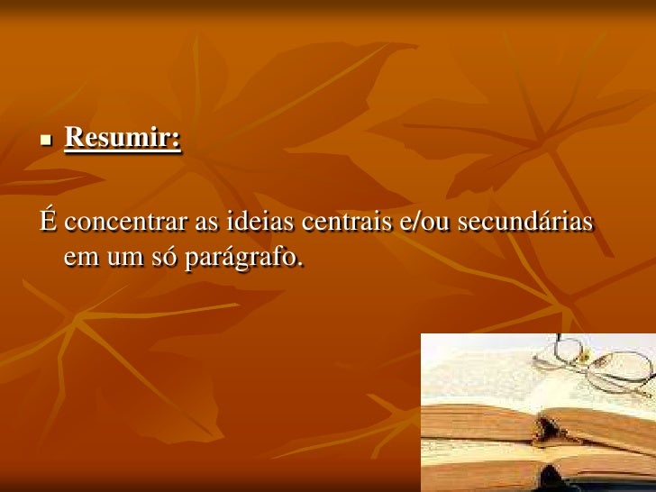 10. 10.  Resumir: É concentrar as ideias centrais e/ou secundárias em um só parágrafo.