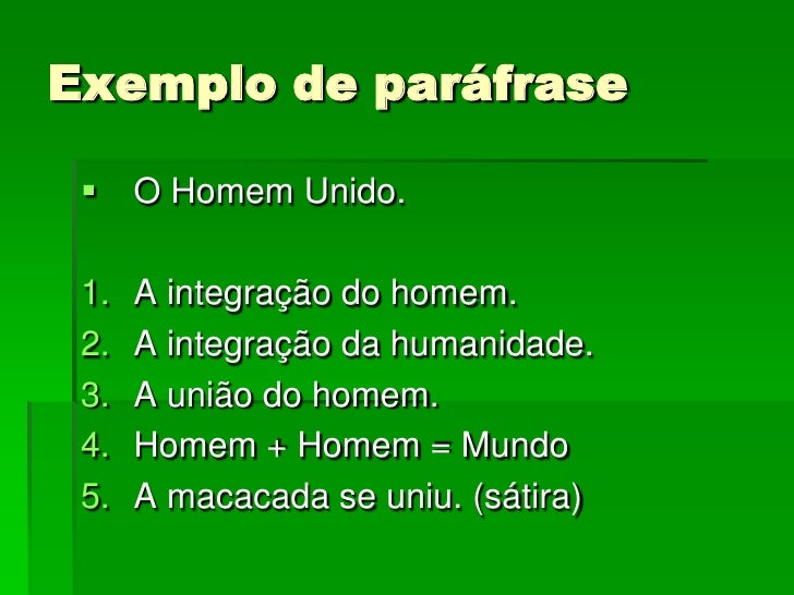 12. 12. Exemplo de paráfrase  O Homem Unido. 1. A integração do homem. 2. A integração da humanidade. 3. A união do homem. 4. Homem + Homem = Mundo 5. A macacada se uniu. (sátira)