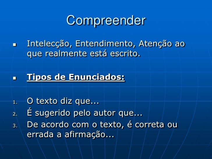 15. 15. Compreender  Intelecção, Entendimento, Atenção ao que realmente está escrito.  Tipos de Enunciados: 1. O texto diz que... 2. É sugerido pelo autor que... 3. De acordo com o texto, é correta ou errada a afirmação...