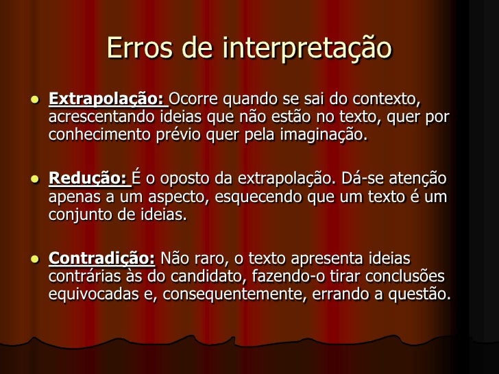 16. 16. Erros de interpretação  Extrapolação: Ocorre quando se sai do contexto, acrescentando ideias que não estão no texto, quer por conhecimento prévio quer pela imaginação.  Redução: É o oposto da extrapolação. Dá-se atenção apenas a um aspecto, esquecendo que um texto é um conjunto de ideias.  Contradição: Não raro, o texto apresenta ideias contrárias às do candidato, fazendo-o tirar conclusões equivocadas e, consequentemente, errando a questão.