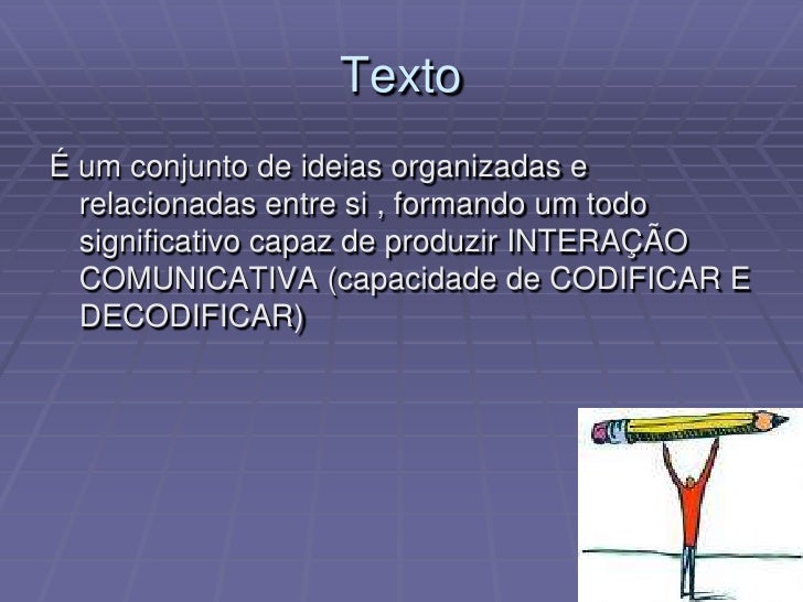 2. 2. Texto É um conjunto de ideias organizadas e relacionadas entre si , formando um todo significativo capaz de produzir INTERAÇÃO COMUNICATIVA (capacidade de CODIFICAR E DECODIFICAR)