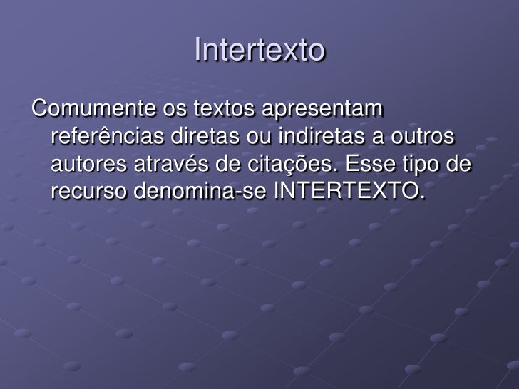 4. 4. Intertexto Comumente os textos apresentam referências diretas ou indiretas a outros autores através de citações. Esse tipo de recurso denomina-se INTERTEXTO.