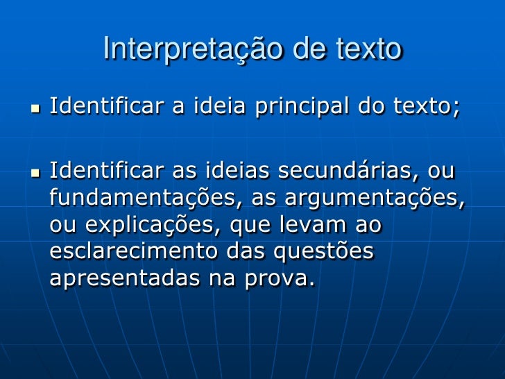 5. 5. Interpretação de texto  Identificar a ideia principal do texto;  Identificar as ideias secundárias, ou fundamentações, as argumentações, ou explicações, que levam ao esclarecimento das questões apresentadas na prova.