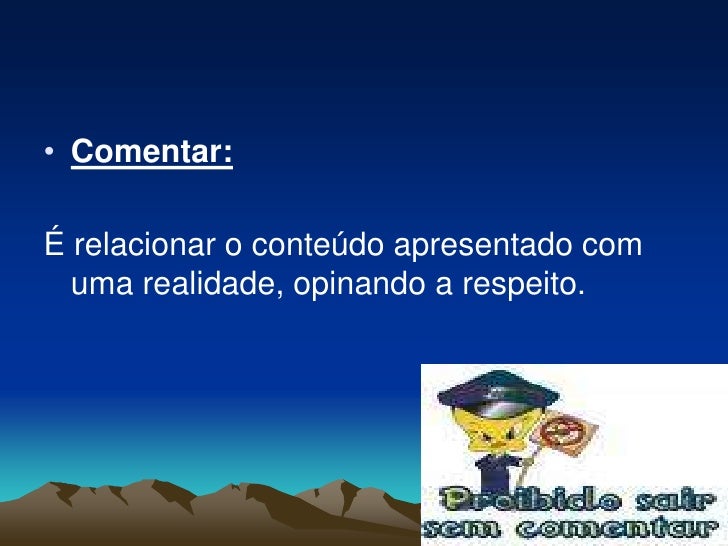 9. 9. • Comentar: É relacionar o conteúdo apresentado com uma realidade, opinando a respeito.