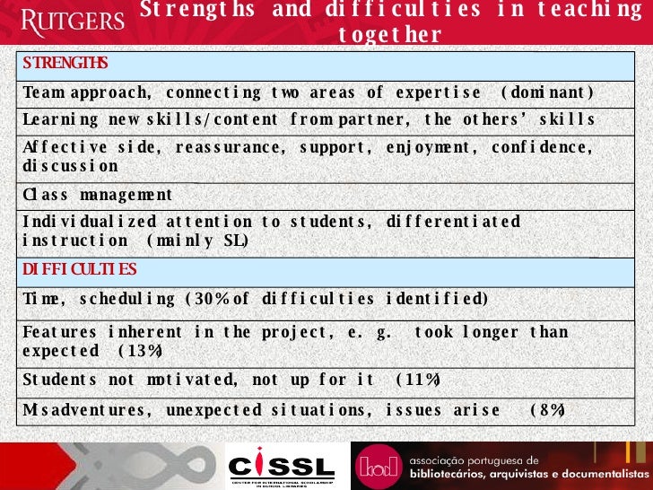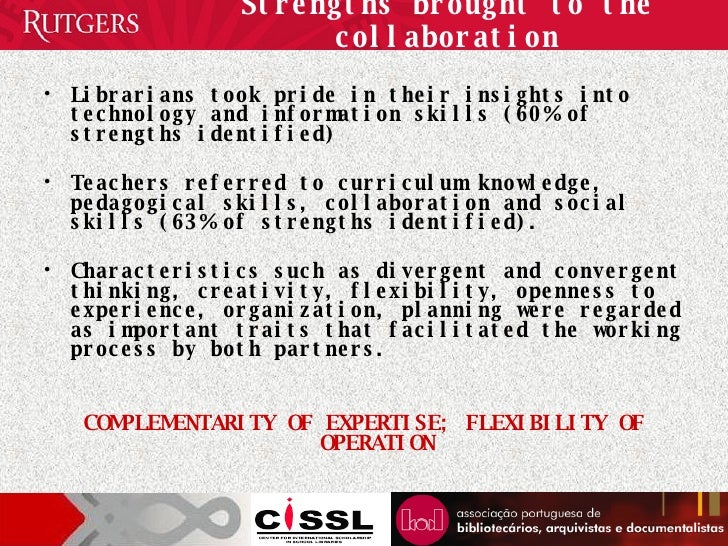9. 10. Strengths brought to the collaboration <ul><li>Librarians took pride in their insights into technology and information skills (60% of strengths identified) </li></ul><ul><li>Teachers referred to curriculum knowledge, pedagogical skills, collaboration and social skills (63% of strengths identified). </li></ul><ul><li>Characteristics such as divergent and convergent thinking, creativity, flexibility, openness to experience, organization, planning were regarded as important traits that facilitated the working process by both partners. </li></ul><ul><li>COMPLEMENTARITY OF EXPERTISE; FLEXIBILITY OF OPERATION </li></ul>