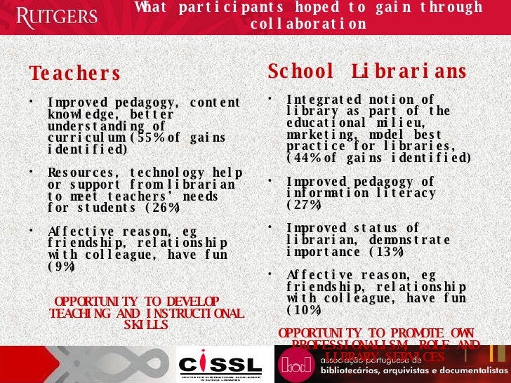 10. 11. What participants hoped to gain through collaboration <ul><li>Teachers </li></ul><ul><li>Improved pedagogy, content knowledge, better understanding of curriculum (55% of gains identified) </li></ul><ul><li>Resources, technology help or support from librarian to meet teachers’ needs for students (26%) </li></ul><ul><li>Affective reason, eg friendship, relationship with colleague, have fun (9%) </li></ul><ul><li>OPPORTUNITY TO DEVELOP TEACHING AND INSTRUCTIONAL SKILLS </li></ul><ul><li>School Librarians </li></ul><ul><li>Integrated notion of library as part of the educational milieu, marketing, model best practice for libraries, (44% of gains identified) </li></ul><ul><li>Improved pedagogy of information literacy (27%) </li></ul><ul><li>Improved status of librarian, demonstrate importance (13%) </li></ul><ul><li>Affective reason, eg friendship, relationship with colleague, have fun (10%) </li></ul><ul><li>OPPORTUNITY TO PROMOTE OWN PROFESSIONALISM, ROLE AND LIBRARY SERVICES </li></ul>