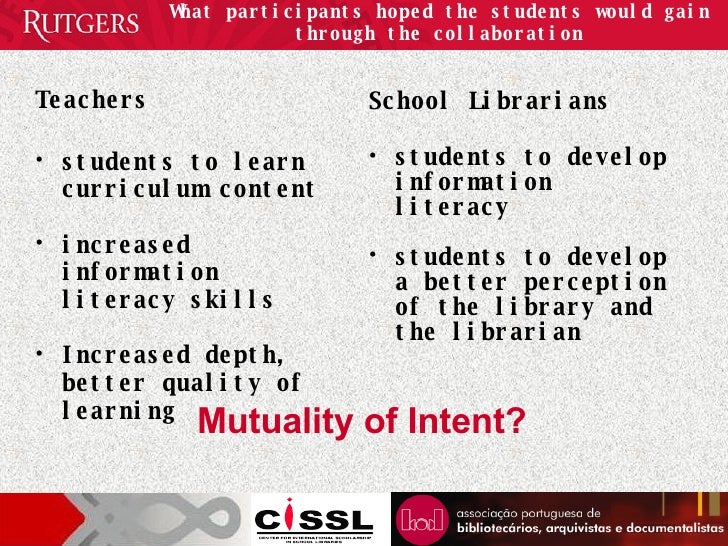 11. 12. What participants hoped the students would gain through the collaboration <ul><li>Teachers </li></ul><ul><li>students to learn curriculum content </li></ul><ul><li>increased information literacy skills </li></ul><ul><li>Increased depth, better quality of learning </li></ul><ul><li>School Librarians </li></ul><ul><li>students to develop information literacy </li></ul><ul><li>students to develop a better perception of the library and the librarian </li></ul>Mutuality of Intent?
