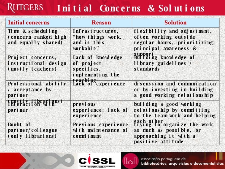 12. 13. Initial Concerns & Solutions trying to organize the work as much as possible, or approaching it with a positive attitude Previous experience with maintenance of commitment Doubt of partner/colleague (only librarians) building a good working relationship by committing to the team work and helping each other previous experience; lack of experience Interaction with partner discussion and communication or by investing in building a good working relationship Lack of experience Professional ability / acceptance by partner (mostly librarians) Building knowledge of library guidelines / standards Lack of knowledge of project specifics, implementing the teaching Project concerns, instructional design (mostly teachers) flexibility and adjustment, often working outside regular hours, prioritizing; principal awareness & support Infrastructures, “how things work, and is this workable” Time & scheduling (concern ranked high and equally shared) Solution Reason Initial concerns