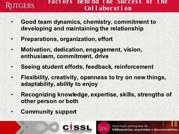 Factors Behind the Success of the Collaboration <ul><li>Good team dynamics, chemistry, commitment to  developing and maint...