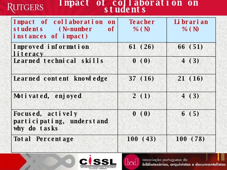 15. 16. Impact of collaboration on students 100 (78) 100 (43) Total Percentage 6 (5) 0 (0) Focused, actively participating, understand why do tasks 4 (3) 2 (1) Motivated, enjoyed 21 (16) 37 (16) Learned content knowledge 4 (3) 0 (0) Learned technical skills 66 (51) 61 (26) Improved information literacy Librarian % (N) Teacher % (N) Impact of collaboration on students (N=number of instances of impact)