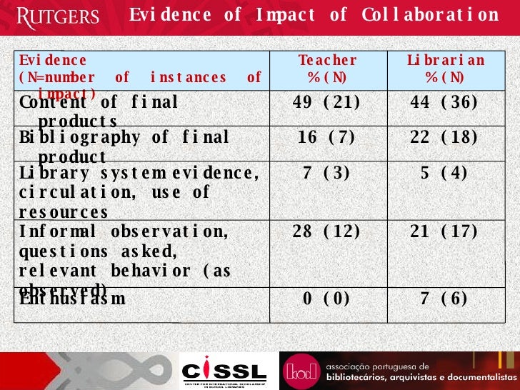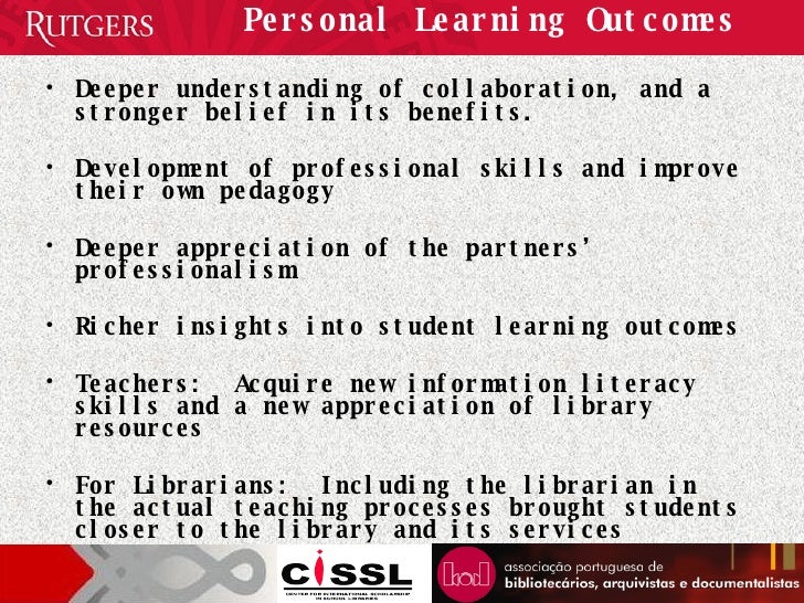 17. 18. Personal Learning Outcomes <ul><li>Deeper understanding of collaboration, and a stronger belief in its benefits. </li></ul><ul><li>Development of professional skills and improve their own pedagogy </li></ul><ul><li>Deeper appreciation of the partners’ professionalism </li></ul><ul><li>Richer insights into student learning outcomes </li></ul><ul><li>Teachers: Acquire new information literacy skills and a new appreciation of library resources </li></ul><ul><li>For Librarians: Including the librarian in the actual teaching processes brought students closer to the library and its services </li></ul>