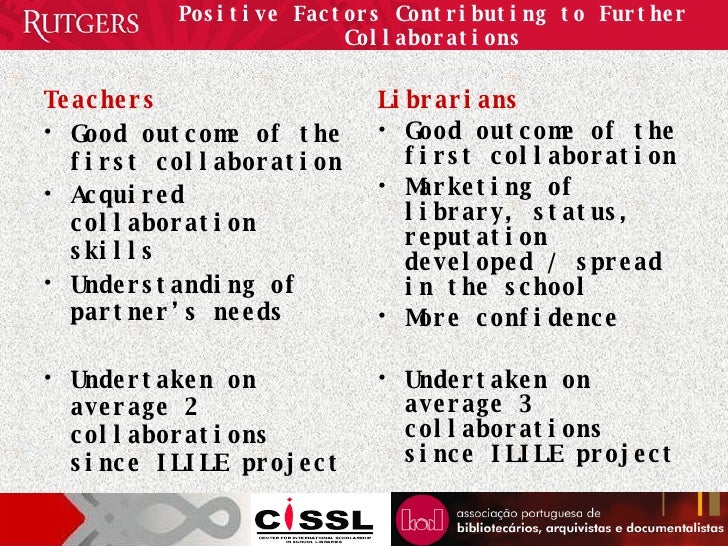 18. 19. Positive Factors Contributing to Further Collaborations <ul><li>Teachers </li></ul><ul><li>Good outcome of the first collaboration </li></ul><ul><li>Acquired collaboration skills </li></ul><ul><li>Understanding of partner’s needs </li></ul><ul><li>Undertaken on average 2 collaborations since ILILE project </li></ul><ul><li>Librarians </li></ul><ul><li>Good outcome of the first collaboration </li></ul><ul><li>Marketing of library, status, reputation developed / spread in the school </li></ul><ul><li>More confidence </li></ul><ul><li>Undertaken on average 3 collaborations since ILILE project </li></ul>