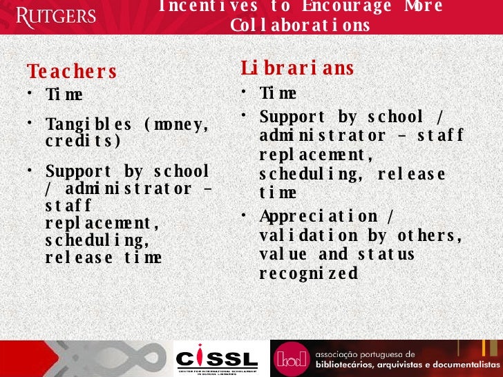 19. 20. Incentives to Encourage More Collaborations <ul><li>Teachers </li></ul><ul><li>Time </li></ul><ul><li>Tangibles (money, credits) </li></ul><ul><li>Support by school / administrator – staff replacement, scheduling, release time </li></ul><ul><li>Librarians </li></ul><ul><li>Time </li></ul><ul><li>Support by school / administrator – staff replacement, scheduling, release time </li></ul><ul><li>Appreciation / validation by others, value and status recognized </li></ul>