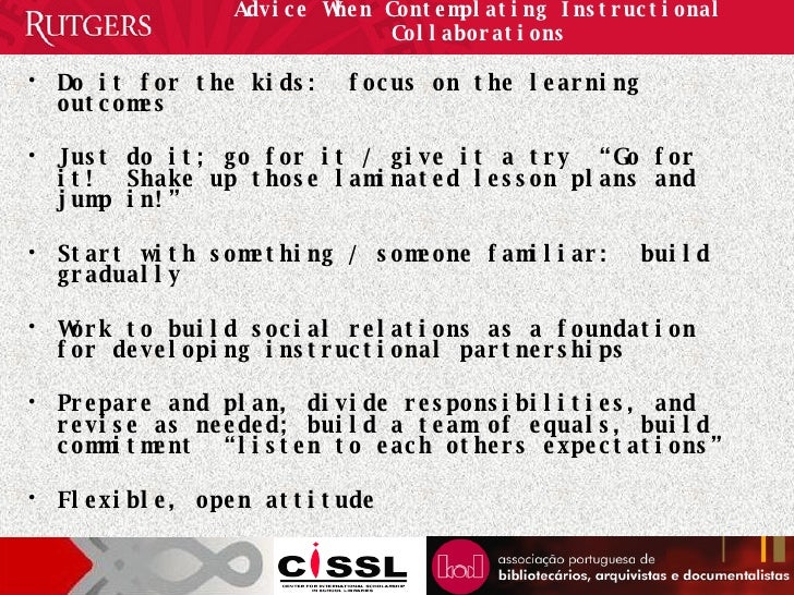 20. 21. Advice When Contemplating Instructional Collaborations <ul><li>Do it for the kids: focus on the learning outcomes </li></ul><ul><li>Just do it; go for it / give it a try “Go for it! Shake up those laminated lesson plans and jump in!” </li></ul><ul><li>Start with something / someone familiar: build gradually </li></ul><ul><li>Work to build social relations as a foundation for developing instructional partnerships </li></ul><ul><li>Prepare and plan, divide responsibilities, and revise as needed; build a team of equals, build commitment “listen to each others expectations” </li></ul><ul><li>Flexible, open attitude </li></ul>