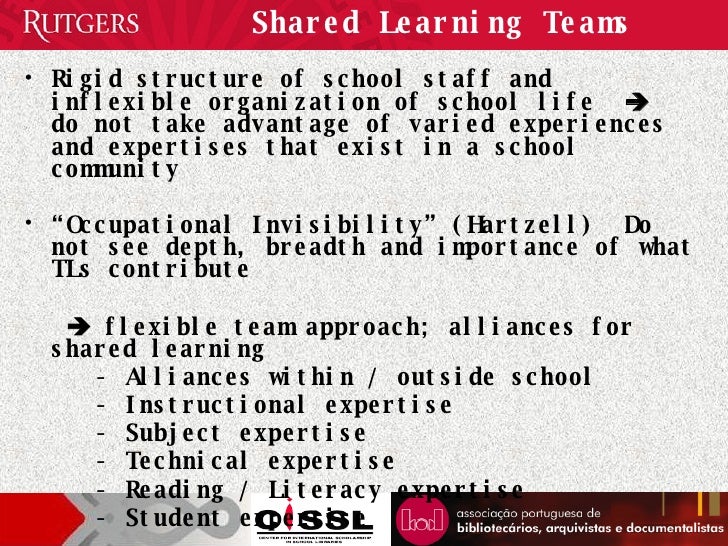 21. 23. Shared Learning Teams <ul><li>Rigid structure of school staff and inflexible organization of school life  do not take advantage of varied experiences and expertises that exist in a school community </li></ul><ul><li>“ Occupational Invisibility” (Hartzell) Do not see depth, breadth and importance of what TLs contribute </li></ul><ul><li>  flexible team approach; alliances for shared learning </li></ul><ul><li>- Alliances within / outside school </li></ul><ul><li>- Instructional expertise </li></ul><ul><li>- Subject expertise </li></ul><ul><li>- Technical expertise </li></ul><ul><li>- Reading / Literacy expertise </li></ul><ul><li>- Student expertise </li></ul>