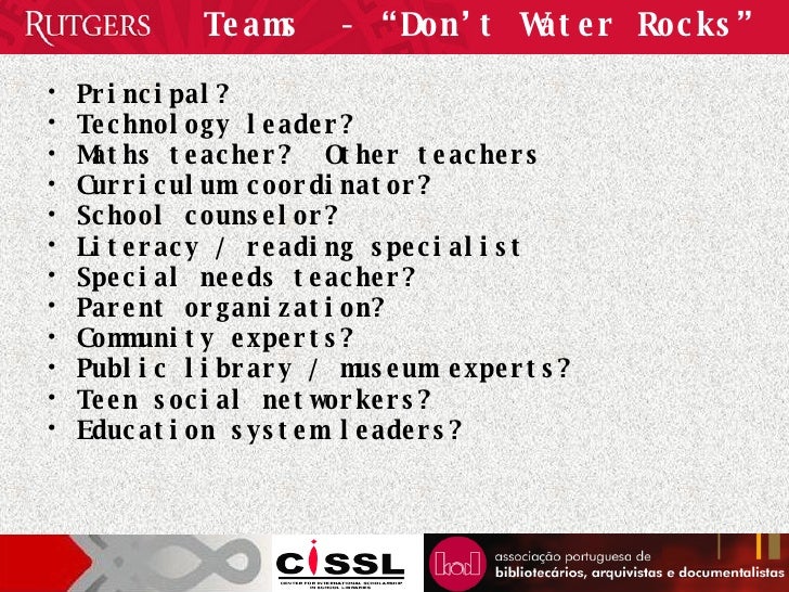 22. 24. Teams - “Don’t Water Rocks” <ul><li>Principal? </li></ul><ul><li>Technology leader? </li></ul><ul><li>Maths teacher? Other teachers </li></ul><ul><li>Curriculum coordinator? </li></ul><ul><li>School counselor? </li></ul><ul><li>Literacy / reading specialist </li></ul><ul><li>Special needs teacher? </li></ul><ul><li>Parent organization? </li></ul><ul><li>Community experts? </li></ul><ul><li>Public library / museum experts? </li></ul><ul><li>Teen social networkers? </li></ul><ul><li>Education system leaders? </li></ul>