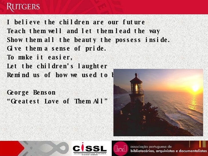 24. 26. <ul><li>I believe the children are our future </li></ul><ul><li>Teach them well and let them lead the way </li></ul><ul><li>Show them all the beauty the possess inside. </li></ul><ul><li>Give them a sense of pride. </li></ul><ul><li>To make it easier, </li></ul><ul><li>Let the children’s laughter </li></ul><ul><li>Remind us of how we used to be </li></ul><ul><li>George Benson </li></ul><ul><li>“ Greatest Love of Them All” </li></ul>