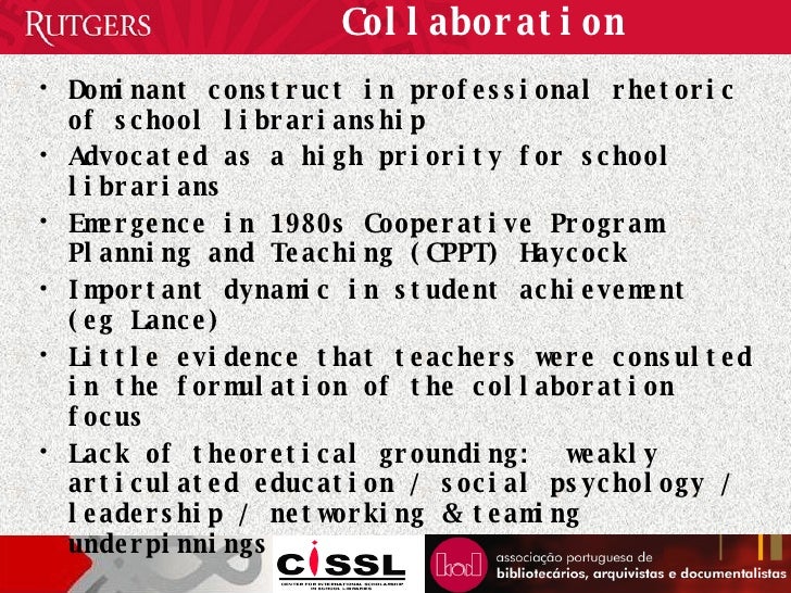 Collaboration <ul><li>Dominant construct in professional rhetoric of school librarianship </li></ul><ul><li>Advocated as a...