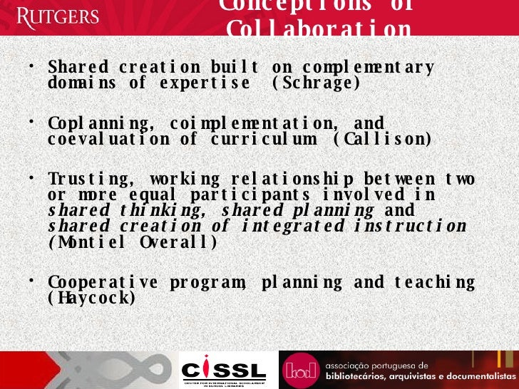3. 4. Conceptions of Collaboration <ul><li>Shared creation built on complementary domains of expertise (Schrage) </li></ul><ul><li>Coplanning, coimplementation, and coevaluation of curriculum (Callison) </li></ul><ul><li>Trusting, working relationship between two or more equal participants involved in shared thinking, shared planning and shared creation of integrated instruction ( Montiel Overall) </li></ul><ul><li>Cooperative program, planning and teaching (Haycock) </li></ul>