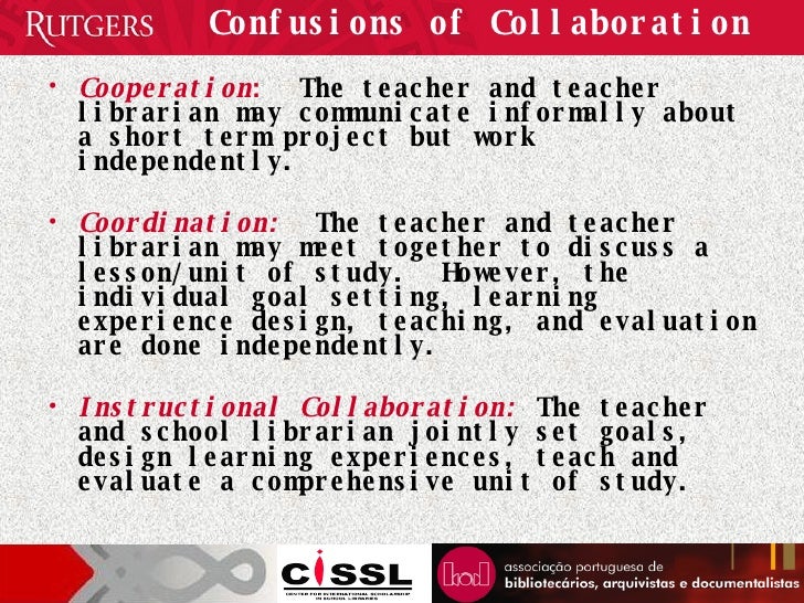 4. 5. Confusions of Collaboration <ul><li>Cooperation : The teacher and teacher librarian may communicate informally about a short term project but work independently. </li></ul><ul><li>Coordination: The teacher and teacher librarian may meet together to discuss a lesson/unit of study. However, the individual goal setting, learning experience design, teaching, and evaluation are done independently. </li></ul><ul><li> </li></ul><ul><li>Instructional Collaboration: The teacher and school librarian jointly set goals, design learning experiences, teach and evaluate a comprehensive unit of study. </li></ul>