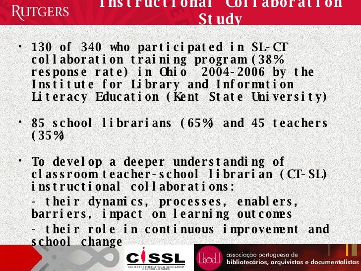 5. 6. Instructional Collaboration Study <ul><li>130 of 340 who participated in SL-CT collaboration training program (38% response rate) in Ohio 2004-2006 by the Institute for Library and Information Literacy Education (Kent State University) </li></ul><ul><li>85 school librarians (65%) and 45 teachers (35%) </li></ul><ul><li>To develop a deeper understanding of classroom teacher-school librarian (CT-SL) instructional collaborations: </li></ul><ul><li>- their dynamics, processes, enablers, barriers, impact on learning outcomes </li></ul><ul><li>- their role in continuous improvement and school change </li></ul>