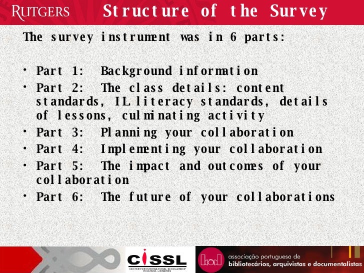 6. 7. Structure of the Survey <ul><li>The survey instrument was in 6 parts: </li></ul><ul><li>Part 1: Background information </li></ul><ul><li>Part 2: The class details: content standards, IL literacy standards, details of lessons, culminating activity </li></ul><ul><li>Part 3: Planning your collaboration </li></ul><ul><li>Part 4: Implementing your collaboration </li></ul><ul><li>Part 5: The impact and outcomes of your collaboration </li></ul><ul><li>Part 6: The future of your collaborations </li></ul>
