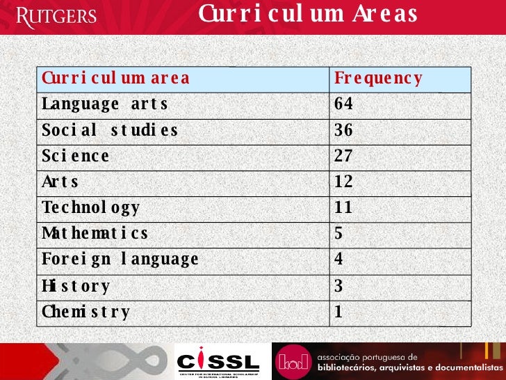 7. 8. Curriculum Areas 1 Chemistry 3 History 4 Foreign language 5 Mathematics 11 Technology 12 Arts 27 Science 36 Social studies 64 Language arts Frequency Curriculum area