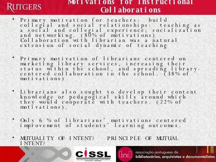8. 9. Motivations for Instructional Collaborations <ul><li>Primary motivation for teachers: build collegial and social relationships: teaching as a social and collegial experience; socialization and networking. (80% of motivations) Collaboration with librarian was a natural extension of social dynamic of teaching </li></ul><ul><li>Primary motivation of librarians centered on marketing library services, increasing their status within the school, and spreading library-centered collaboration in the school. (38% of motivations) </li></ul><ul><li>Librarians also sought to develop their content knowledge or pedagogical skills around which they would cooperate with teachers. (22% of motivations). </li></ul><ul><li>Only 6 % of librarians’ motivations centered improvement of students’ learning outcomes. </li></ul><ul><li>MUTUALITY OF INTENT? PRINCIPLE OF MUTUAL INTENT? </li></ul>