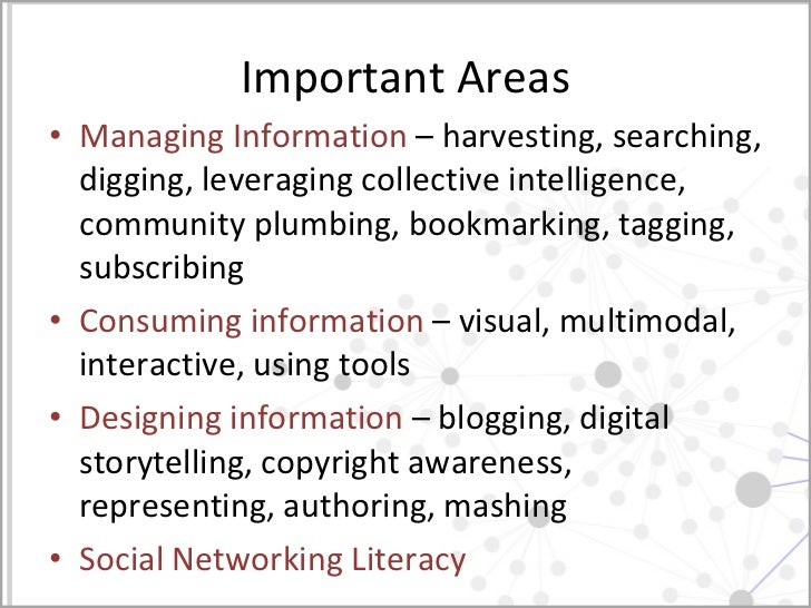 The presentation discusses emerging literacies and argues that school curriculum mus tbe revised to teach students to manage information, make meaning from multimodal text and represent knowledge and information. The session also introduces an idea of social networking literacy.